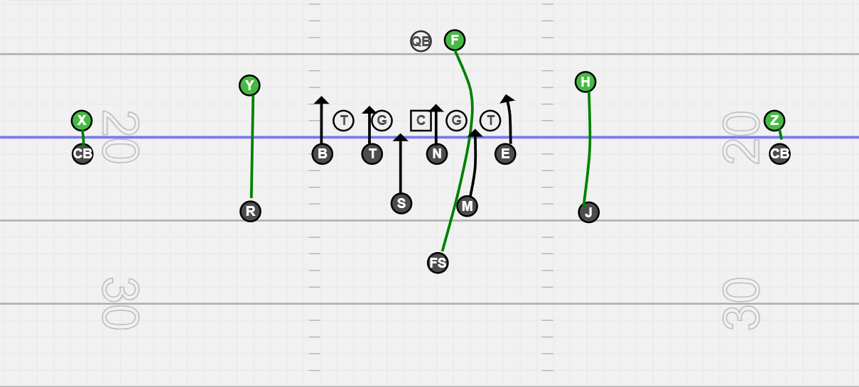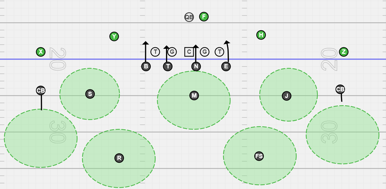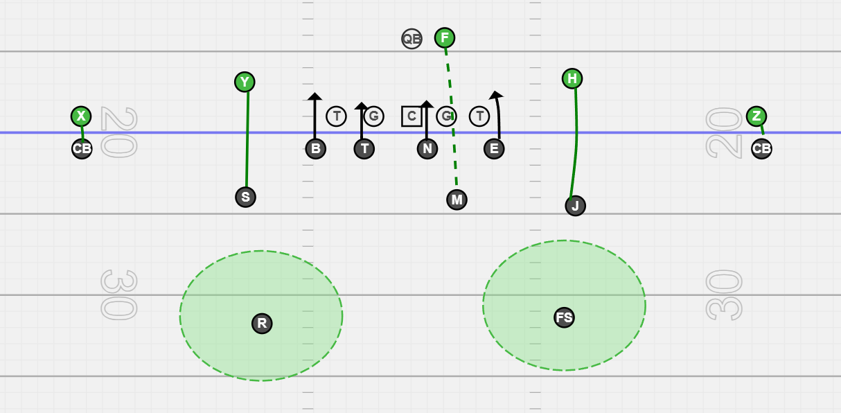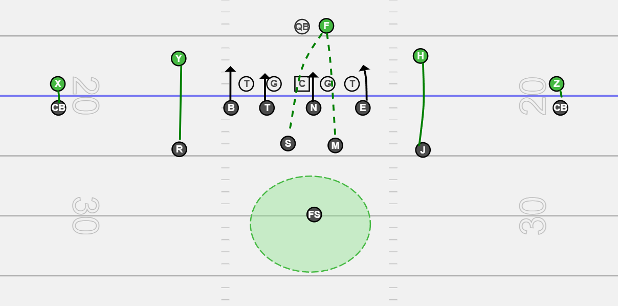 The strong safety and the free safety are responsible for one-half of the field each. They cover any and all deep routes that go into their deep zone.