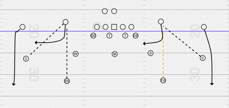 Teams that want to stay in their two-high safety often play cover 6 against any offense that features 3×1. This allows teams to have even spacing across the field and play all the zones to cover the receivers.