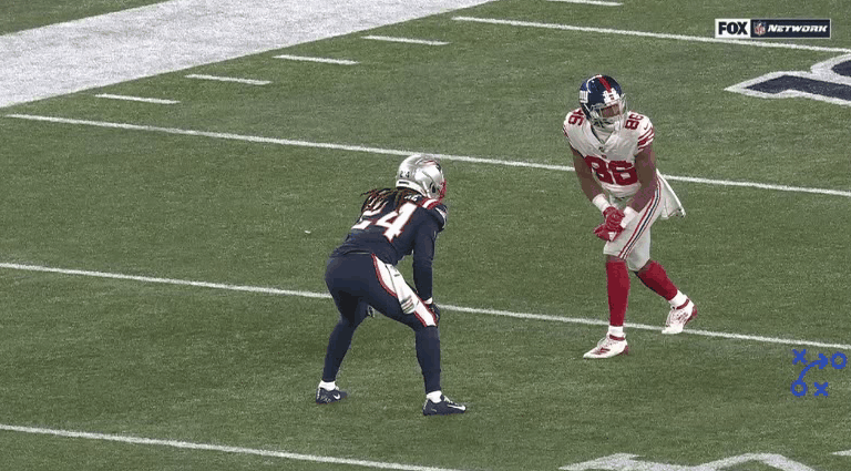 He’s off-balance as he transitions upfield, mainly because of his first two initial hop steps. When he turns his hips and gets into his transition, his feet are together. This forces his next step to be an over-stride, which puts him off balance. The receiver times it up perfectly and washes him away at this exact moment.