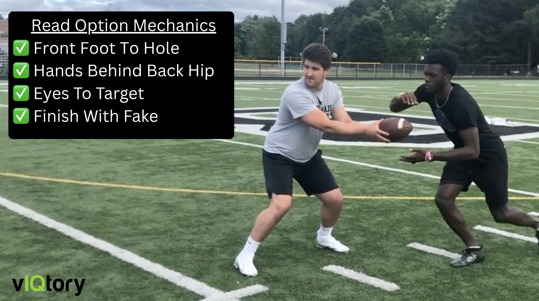 When running read option, it’s important that the quarterback has two hands firmly on the ball and is reaching behind him.