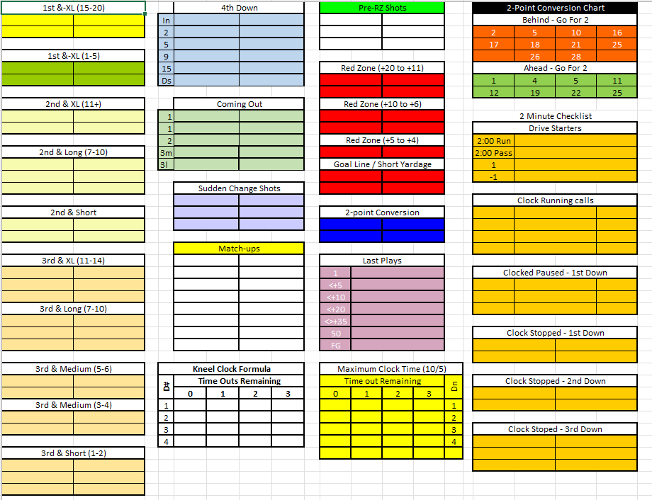 Remember, there are fewer than 30 seconds that you have in between plays to make a call. Eliminate all the game day stress by properly organizing your call sheet.