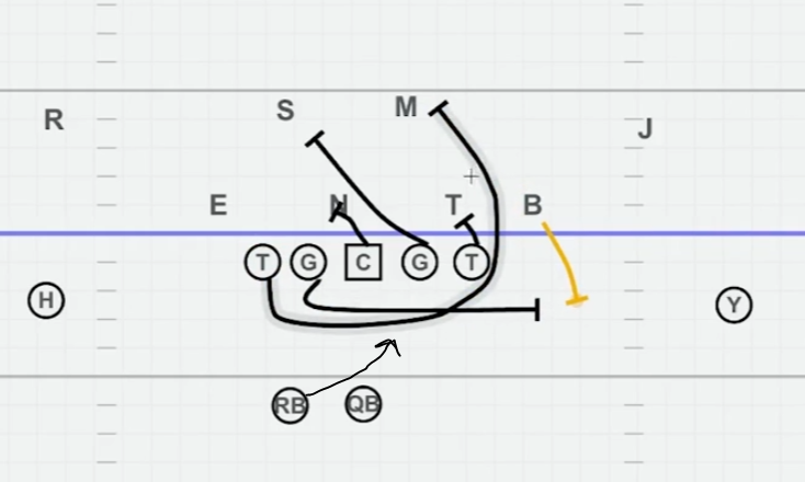 First, the offensive lineman on the called side will be gap blocking, also known as down blocks. This means they will try to push the player in their backside gap, away from the play. The play side guard and tackle will be working a double team to the backside linebacker. This is similar to what we discussed in the power read and 1 back power article.