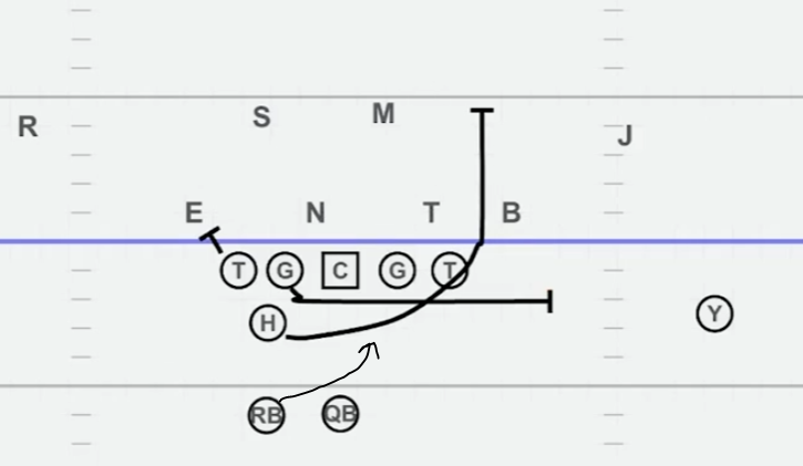 Power looks similar to counter, but the main difference is who is pulling and the footwork of the running back. There are no delay steps in power, as it’s a fast-hitting play toward the play side.