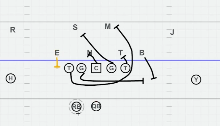 As you can see, the play is being run to the left side. The offensive line will block the player in the gap opposite the play (the right side). The two tackles and the center will block the defensive lineman away from the play. The H-back will also block down on the play-side defensive end.
